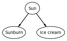 As an example, let’s suppose we collect daily data on sunburns and ice cream sales for an entire year. We find a strong positive association in the data: days with higher ice cream sales have much higher sunburn rates. Clearly, sunburn doesn’t cause increased ice cream sales, and increased ice cream sales don’t cause sunburns, either. This example fails to take into account the confounding effect of the weather: hot, sunny weather causes people to buy more ice cream, and also causes more sunburns. We can illustrate this using a directed graph, similar to the ones we used in Bayesian graphical models: